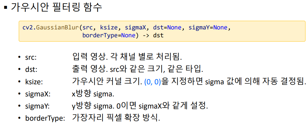 스무스하게 만들어줍니다. // 가우시안 분포의 그래프도 정규분포 그래프 처럼 가운데가 볼록하죠.