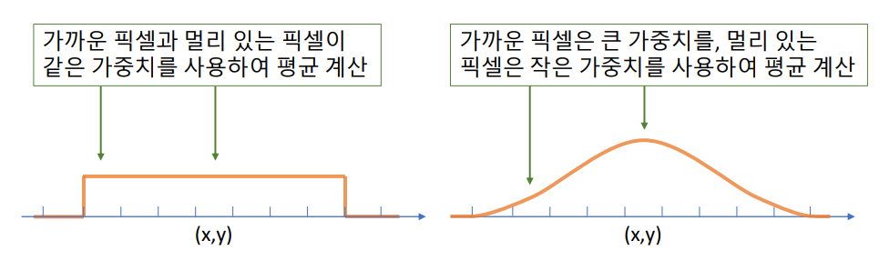 • 필터링 대상 위치에서 가까이 있는 픽셀과 멀리 있는 픽셀이 모두 같은 가중치를 사용하여 평균을 계산