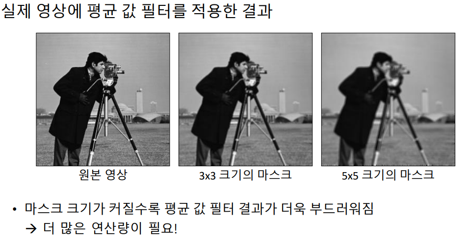 • 픽셀들 간의 그레이스케일 값 변화가 줄어들어 날카로운 에지가 무뎌지고, 영상에 있는 잡음의 영향이 사라지는 효과