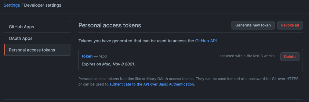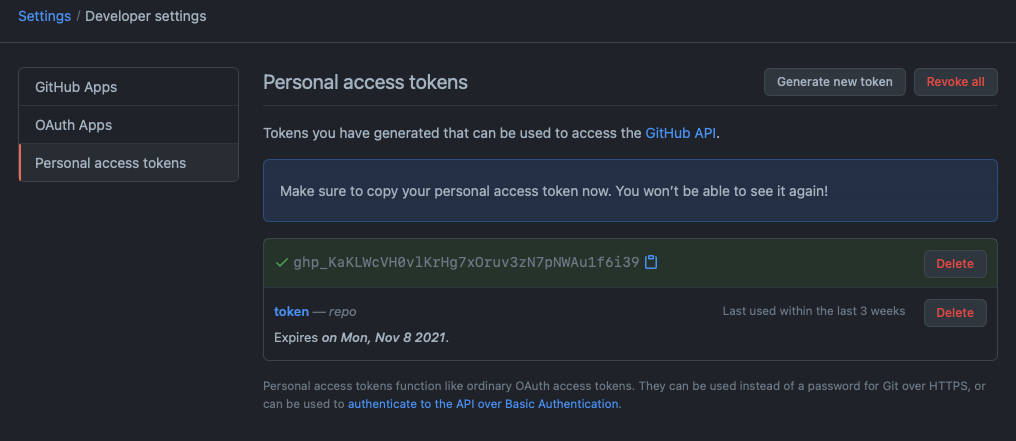 저는 토큰 발급 해서 블로그 첨부용으로 스샷을 찍고 해당 토큰을 바로 Revoke 했지만, 실제 본인이 사용하는 Token의 경우에는 코드가 유출되지 않도록 주의 해야 합니다. 특히나 You won't be able to see it again! 에서 보이는 것 처럼 다시 보여주지 않으니 잘 카피 하거나 로그인 할 때까지는 해당 창을 닫지 않도록 합니다. 저는 어디 적어두는 것도 보안상 좋지 않다고 생각해서 Sourcetree를 연결 할 때 까지 해당 창을 띄워 두고 따로 복사해두지 않아서 토큰값은 아무도 모르게 됩니다.