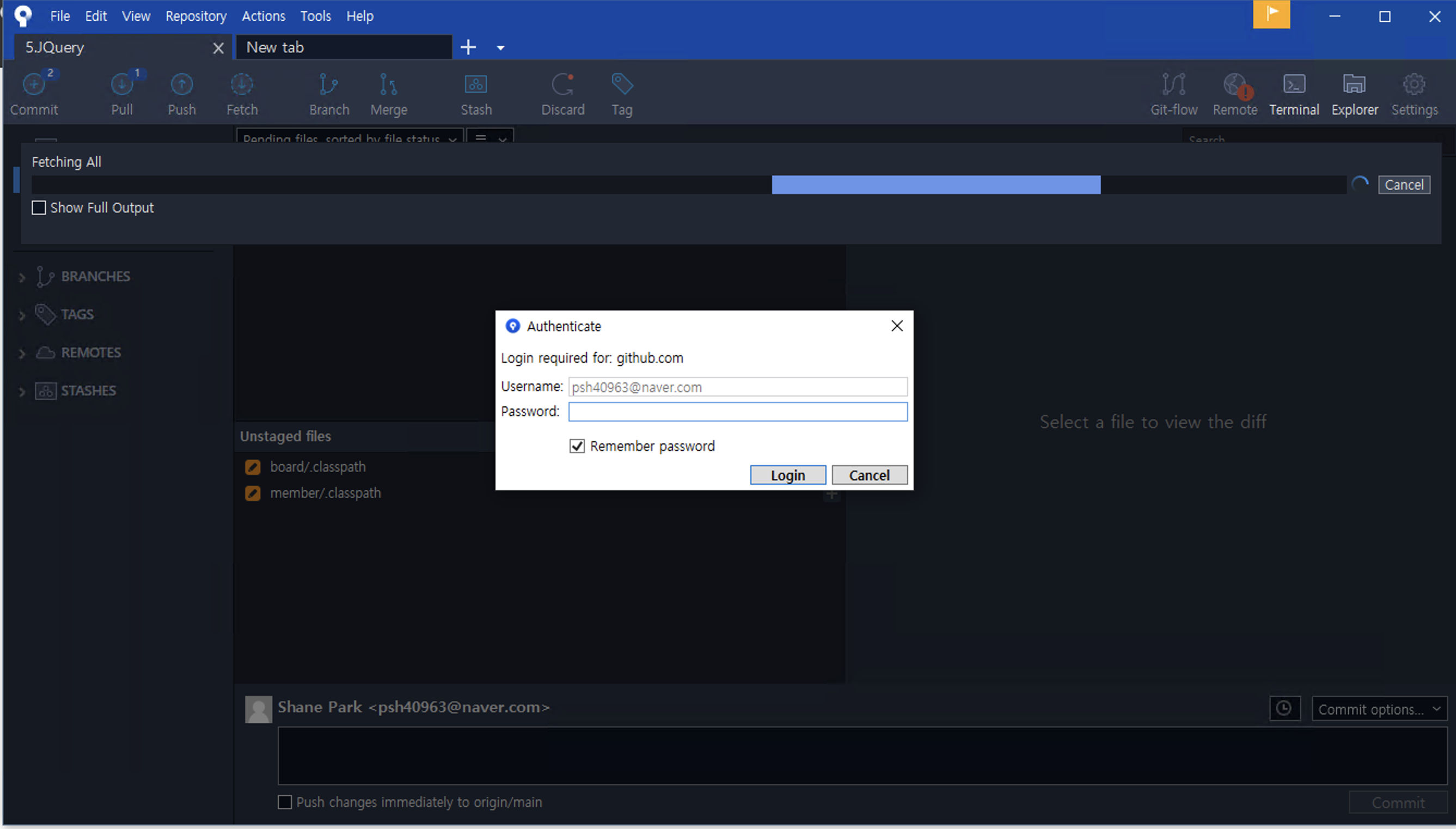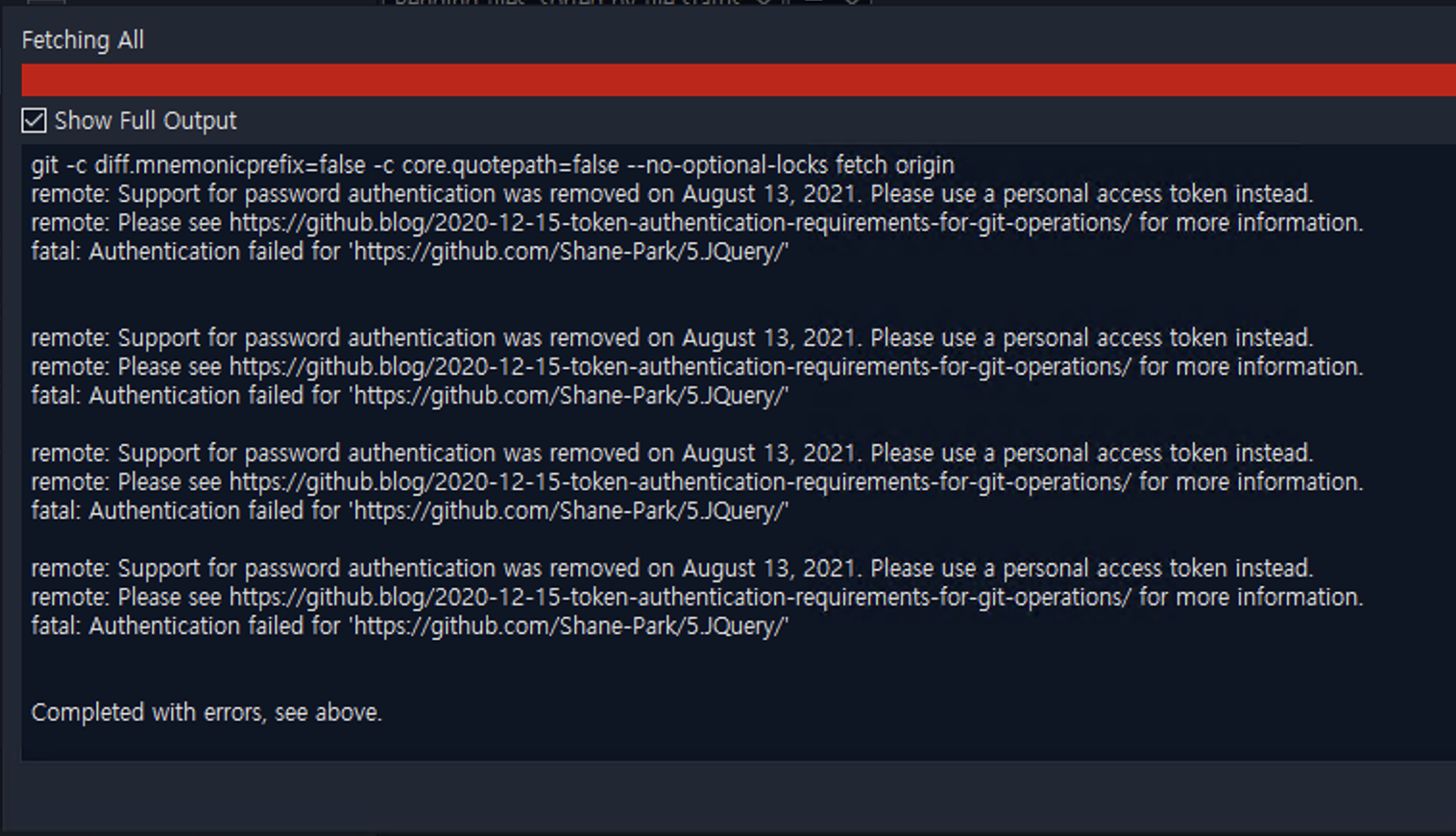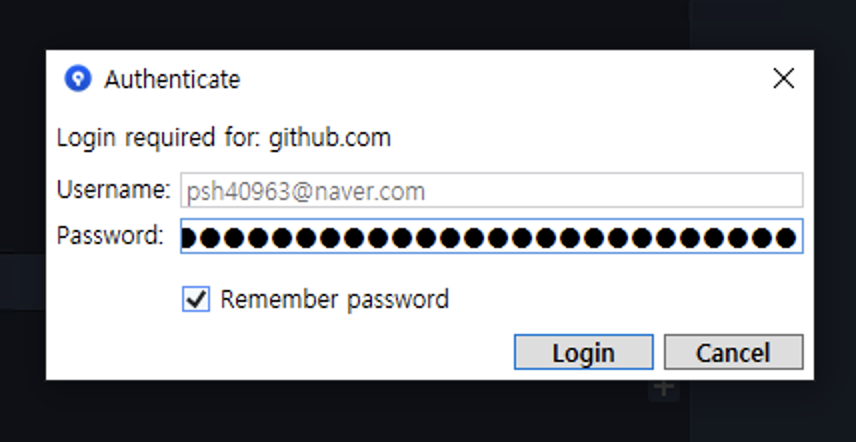 이제 다시 Fetch 나 Pull 을 시도 해 봅니다. 비밀번호를 입력하라는 화면이 나옵니다!