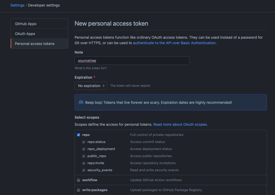 그리고 scopes 설정을 해주는데, sourcetree 에서 쓰기에는 repo만 있으면 충분 한 것 같습니다. Expiration은 해당 Token의 유효기간인데, No expiration 의 경우에는 상황에 따라 보안상 위혐이 될 수 있기 때문에 권장하지 않습니다.
