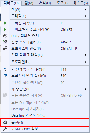 1. Visual Studio에서 디버그 -> 옵션을 클릭합니다.