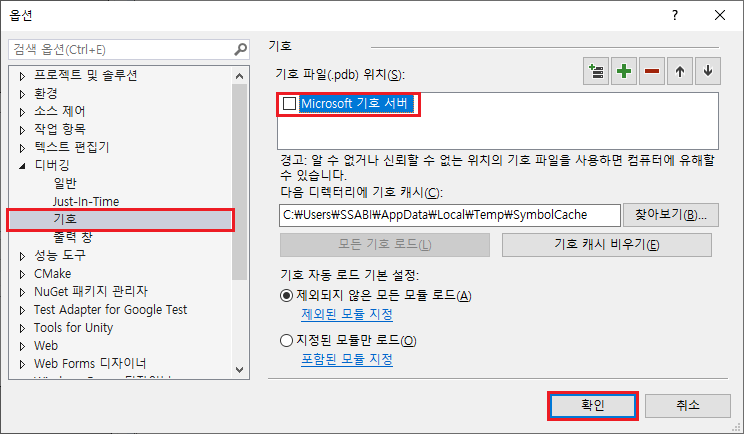 2. 옵션창에서 디버깅 -> 기호에서 기호 파일(.pdb) 위치에서 Microsoft 기호 서버를 체크 해제한 후 확인을 클릭합니다.