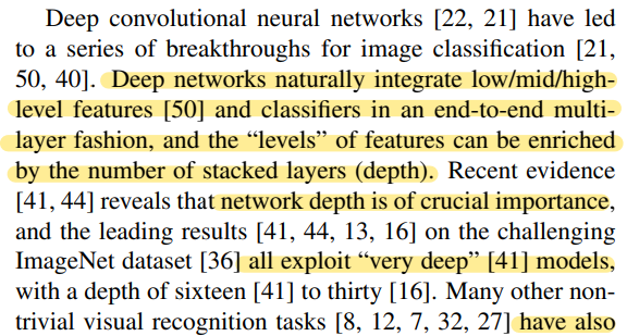초록에서는 depth의 중요성과 residual learning에 대해 간략히 설명하고 있다.