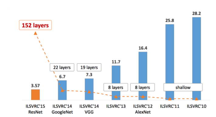 역대 ILSVRC 대회 결과를 보면, dept의 깊이가 모델의 성능에 큰 영향을 준다는 것을 알 수 있다. 즉, visual recognition task에서 depth는 매우 중요한 요소이다. 하지만, depth가 올라감에 따라 필연적으로 발생하는 문제도 있는데, 오버 피팅, gradient의 소멸, 연산량의 증가 등이 있다. 따라서 심층 신경은 학습시키기가 상당히 까다로운데, 이에 마이크로소프트 팀은 residual learning framework를 이용하여 이전보다 훨씬 깊은 네트워크를 더 쉽게 학습시킬 수 있었다고 한다.