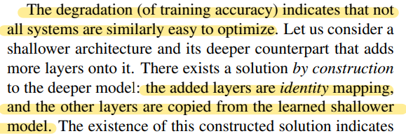 하지만, deeper 모델에서도 제한된 상황에서는 최적화될 수 있는 방법이 있다. 이 방법은 추가된 레이어가 identity mapping이고, 추가되지 않은 다른 레이어들은 더 얕은 모델에서 학습된 layer를 사용하는 것이다. 이같이 제한된 상황에서의 deeper 모델은 shallower 모델보다 더 낮은 training error를 가져야 하고, 마이크로소프트 팀은 이 개념을 모델에 적용하였다.