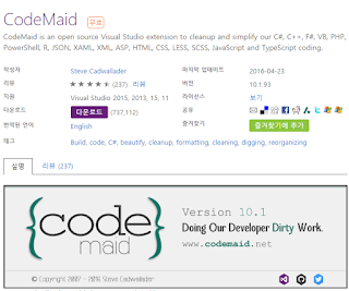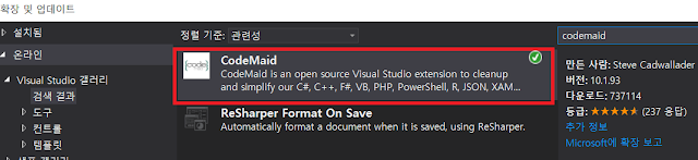 VS에서 제공하는 C# 기능 중 하나가 문서 서식을 자동으로 정리해 주는 기능인데 이 기능이 없는 것 보다는 좋긴 하지만 약간 아쉬움이 생길 때가 있는데 최근에 사용하는 추가 addon이 CodeMaid라는 도구 입니다.