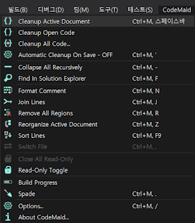 설치 후 재실행 해주면 CodeMaid 기능을 사용할 수 있는 메뉴가 생깁니다.