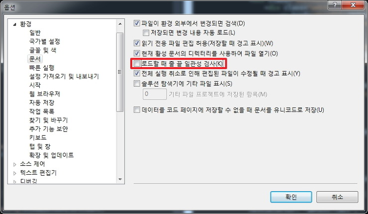 줄 끝 타입이 혼용되는 경우는 보통 Copy & Paste를 하거나 SVN 이나 Git 같은 버전 관리 프로그램에 의해 Merge 되었거나 할 때 자주 일어납니다. 위와 같은 경고창이 보기 싫다면 Visual Studio의 옵션 창에서 줄 끝 일관성 검사 항목을 해제 해주면 됩니다.